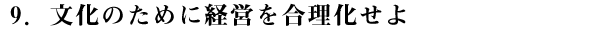- 商売を継続するには、古きを捨て、新しきを得ることである。つまり、価値の無くなった商品やサービスを捨て、新しいものを生み出すことで継続することができる。これが合理化である。そして、商売の継続は一つの文化を成していく。商人よ、あなたの文化をつくれ!